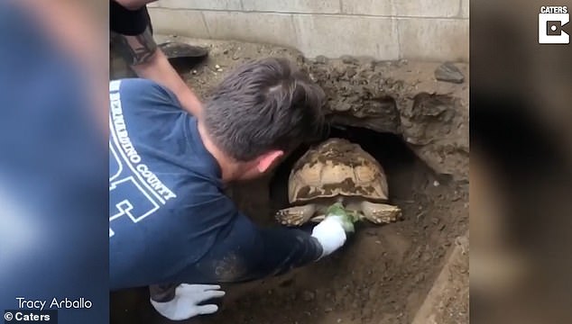 ▼消防員擴大洞口,用力拖小被被,但裡面的小動物沒有出來。原來Godzilla老神在在擋在洞口,根本沒有讓Taylor出來的意思。消防員拿來生菜、胡蘿蔔,想把Godzilla引出來。同時他們還用工具幫Godzilla慢慢向前移動,直到騰出足夠的空間,Taylor才溜出來。