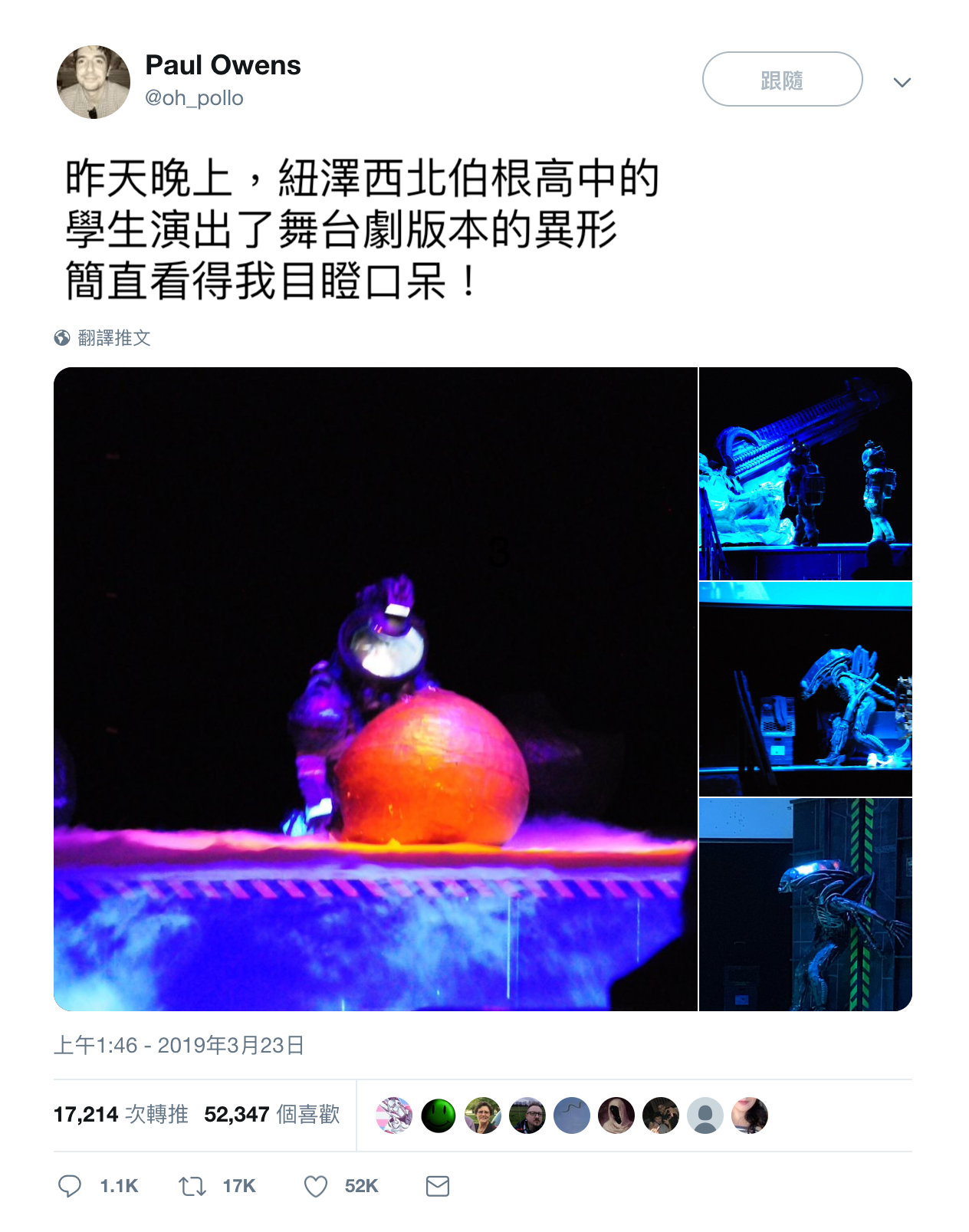 2019年03月26日長長的後腦、恐怖的血盆大口、詭異而讓人膽寒的外型…從1979年開始、直至今日已經有6集的《異形》電影系列,至今仍一直是人們津津樂道的經典。日前位於美國紐澤西的「北伯根高中」(North Bergen High School)的戲劇社學生以1979年的首集《異形》電影為本演出舞台劇,佈景、服裝的完成度都超高,讓人驚豔!