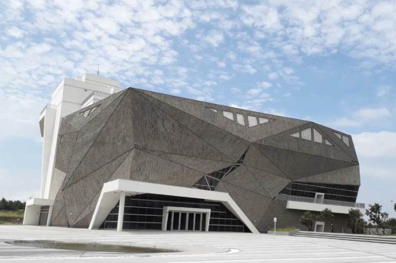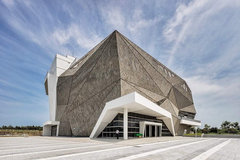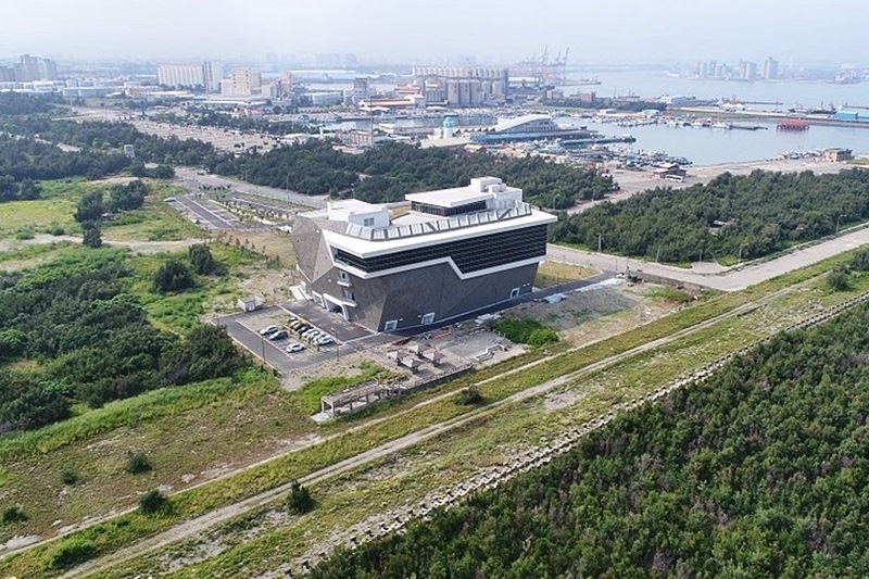 ▼台中海洋生態館位於梧棲觀光漁港附近,建築外觀以「岩石」作為設計構想,原先外觀以白海豚作為構思,後來改為岩石,主要代表台中港是由大甲溪沖刷的基石所填築而成的。因岩石有很多角度,所以施工難度比一般建築還高。