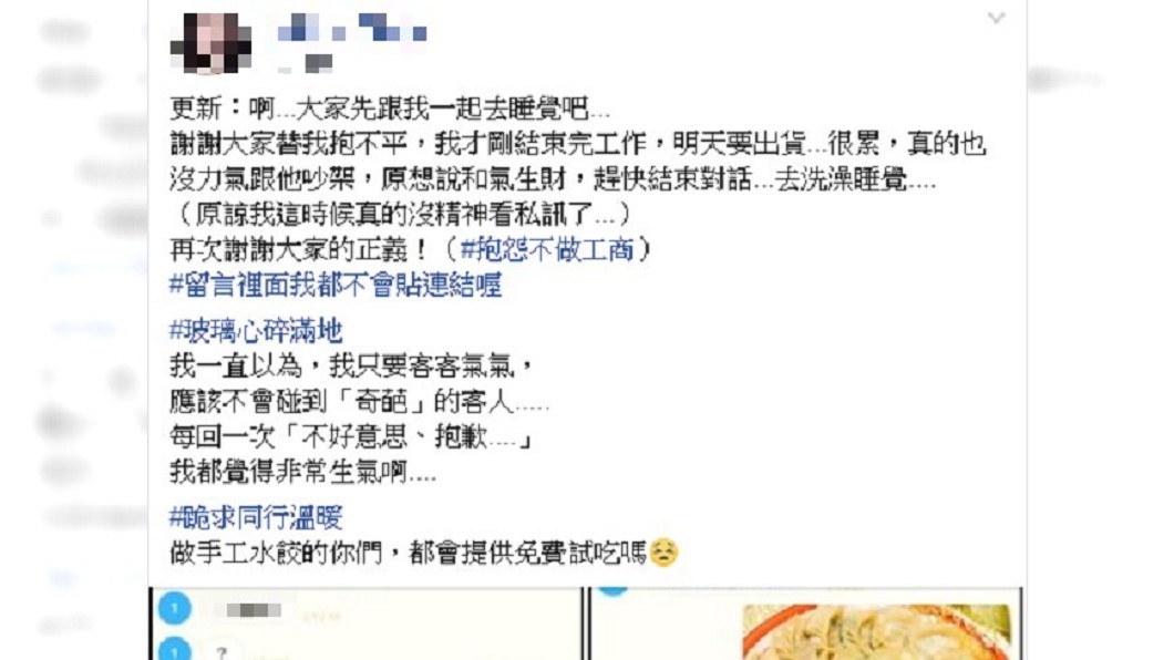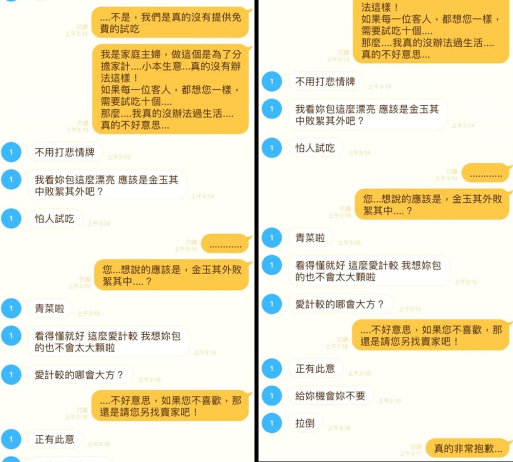 ▼原PO看到這種情況,只能選擇不斷致歉表示「真的很不好意思,我們沒有提供免費試吃的服務」,但是奧客卻不放棄,還加重語氣說「其他家都會給我試吃 好吃再買 妳不行?」、我是看妳粉絲團照片,包得挺漂亮的,賞妳臉 給妳機會,妳不要?」。