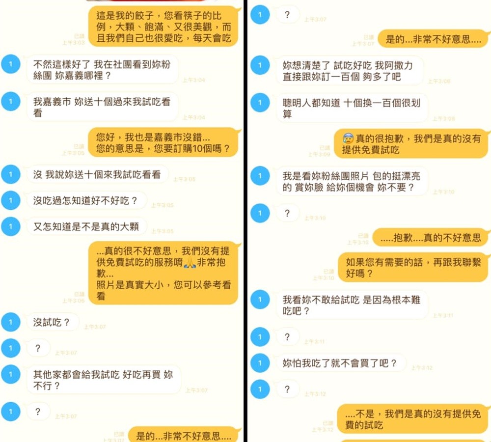 網友看了聊天記錄也大感不可思議,無法相信現在居然還有人的臉皮可以比犀牛皮還厚!大家都認為奧客根本無心要買水餃,「一看就知道是來鬧的吧!」、「永遠吃免錢的概念」、「我是嘉義人以他為恥,不要出去丟臉啦傻眼」!怎麼會有這樣的人啊?連拗免費試吃還可以如此理直氣壯,真的太欺負人了!希望他可以看到網友的反應,不要再這樣去鬧別人了!