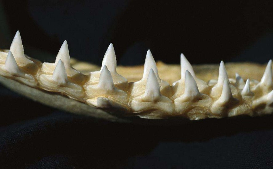 ▼鯊魚一般同時擁有5~6排牙齒,最外排的牙齒起到一般牙齒的作用,其他的幾排牙齒都是備用的,當最外排的牙齒脫落後,裡面的牙齒就會取代外排的空缺,有些鯊魚一生中甚至會替換掉3萬顆以上的牙齒。