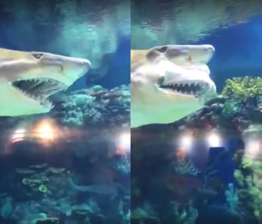 2019年04月04日在人們的印象中,鯊魚是非常兇猛可怕的動物,牠的血盆大口一張開就會令人毛骨悚然。在臉書「爆笑公社」瘋傳一段影片,水族館裡的一隻鯊魚張開嘴巴露出鋒利的牙齒,但是下一幕卻讓網友笑翻了。