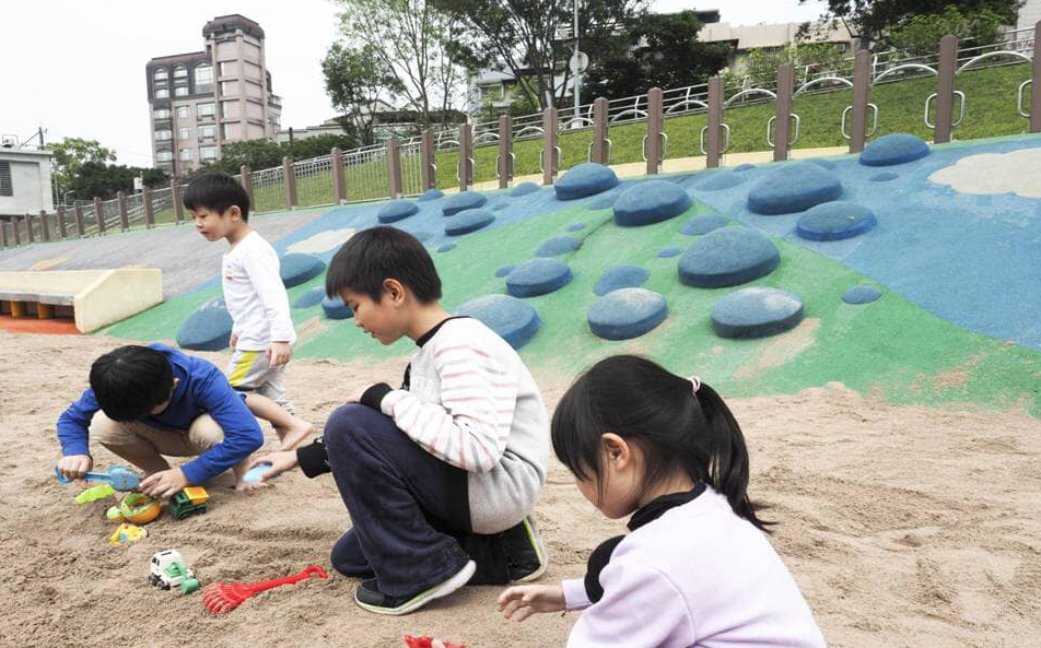 ▼遊戲沙坑區與磨石子溜滑梯在同一個地方,小孩一溜下去就可以玩沙,設計非常用心。