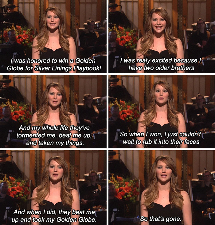 ▼4.「我因為《派特的幸福劇本》獲得金球獎的時候超興奮的,因為我有兩個哥哥,我的整個人生都被他們折磨。他們打我,還拿我的東西。我得獎時迫不及待想要揉到他們臉上。我真的那麼做了,結果他們打我,還拿走了我的獎,所以我的金球獎沒有了。」