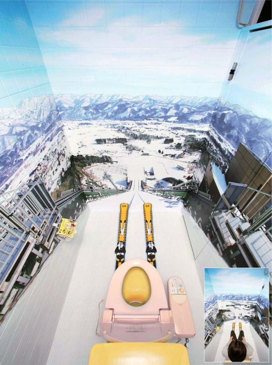 ▼其實日本還有不少別具特色的廁所,比如長野縣斑尾高原滑雪場的廁所,將馬桶擺放在模擬滑雪跳台的位置,不僅可以觀賞滑雪場的壯麗美景,還多了一份刺激感。