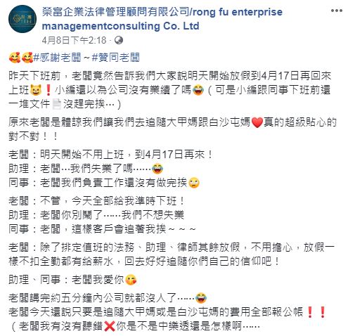 ▼「榮富企業法律管理顧問有限公司」的臉書小編在4月7日於臉書發文,表示老闆宣佈「明天開始放假到4月17日再回來上班」,讓員工以為大家要集體失業了,一些員工也擔憂手邊的工作還沒做完無法放假。不過老闆堅持要所有人準時下班放假去,還表示「除了排定值班的法務、助理、律師其餘放假,而放假的員工一樣不扣全勤都有薪水」。