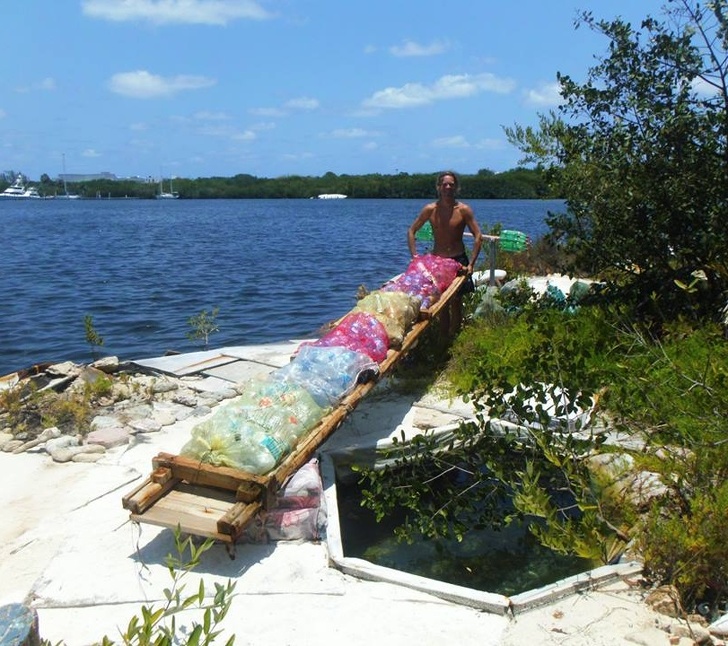 ▼理查用撿來的10萬個塑膠瓶製在墨西哥穆赫雷斯島附近建造出了人造島,他用很多網將塑膠瓶裝起來,圍在一起成為人造島的地基,底部用錨來固定。