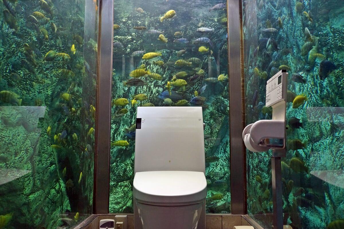 ▼廁所就像一座小型的水族館,三面環繞著巨大的水箱。水箱中有上百隻魚,還有烏龜呢。不過這間廁所僅供女性使用,餐廳內的男廁所就是很普通的裝潢。工作人員表示,如果店裡客人不多,他們也會將這間特別的廁所開放給男顧客使用。