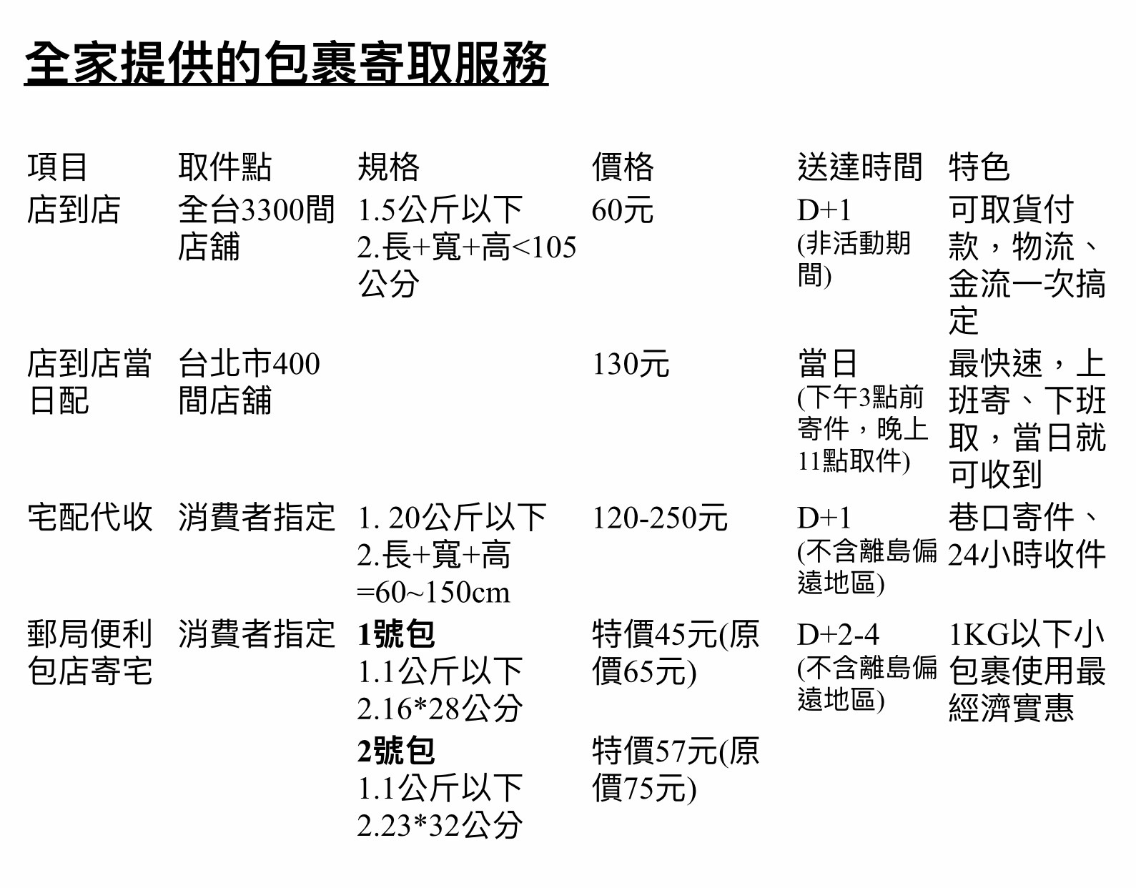 ▼此外,目前試營運也推出寄件優惠價,1號便利包(16x28 cm)優惠價45元、2號便利包(23x32 cm)優惠價57元,比現行全家店到店的60元寄件費更便宜~