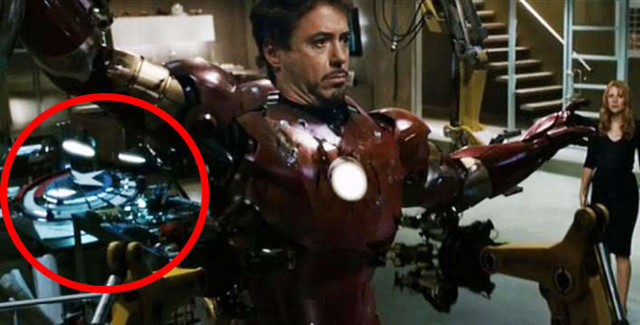 ▼8. 小辣椒在《鋼鐵人》裡幫東尼史塔克脫下壞掉的鋼鐵裝,眼尖的觀眾會看到美國隊長的盾牌就在背景畫面裡。