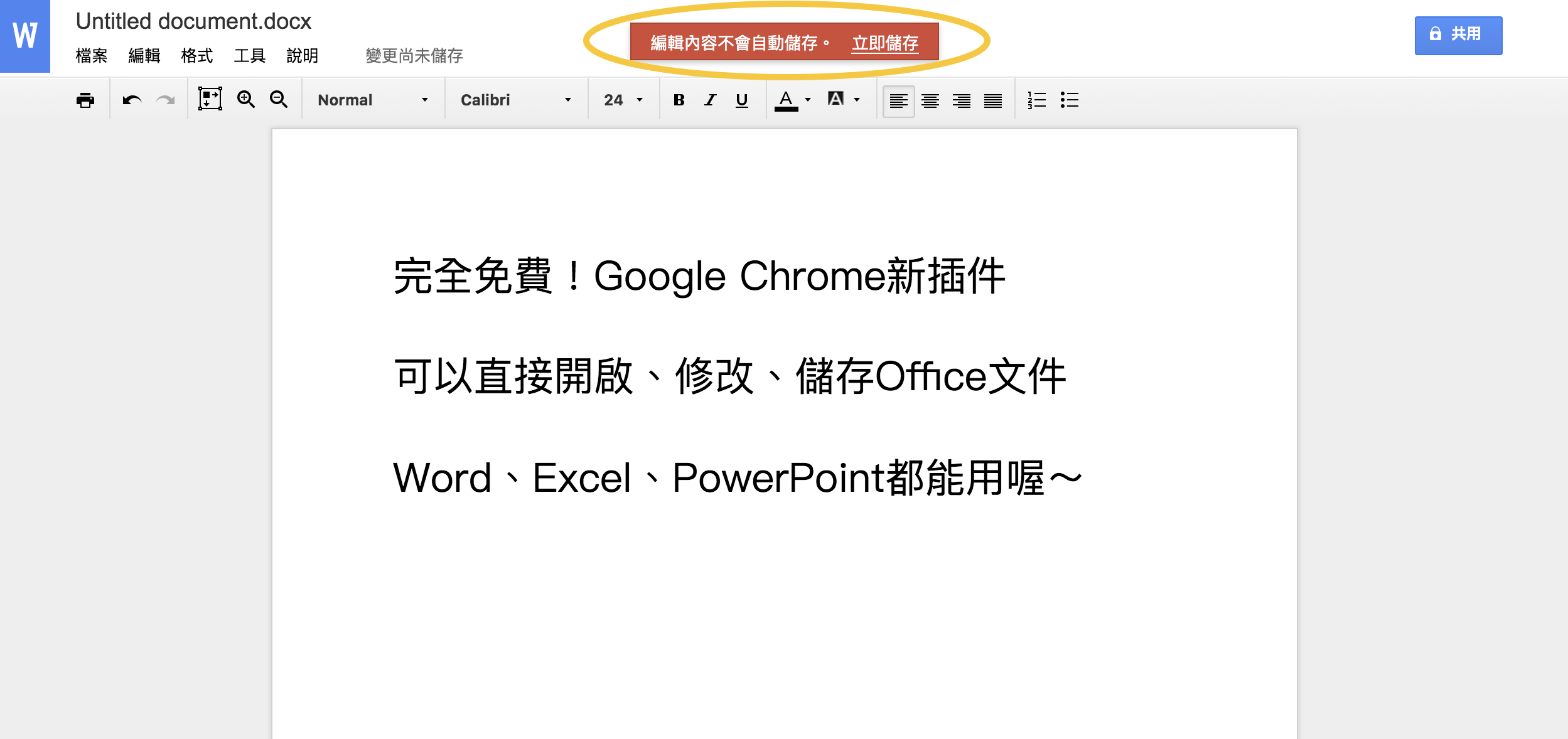 ▼舉例而言,當用戶使用Chrome擴充功能的Word時,輸入文字後,畫面上方會提示「編輯內容不會自動儲存」;若選擇「立即儲存」,即可以直接將文件轉換為Office檔案、儲存在電腦中。