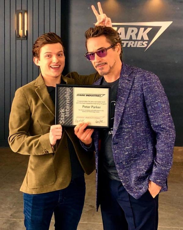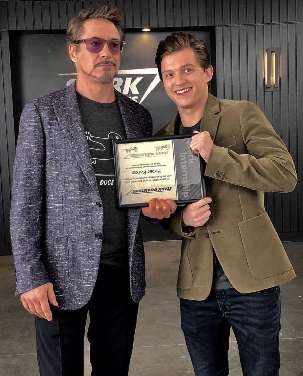 ▼而飾演「鋼鐵人」的小勞勃道尼(Robert Downey Jr.)也在個人 IG 上分享了與「蜘蛛人」湯姆荷蘭 (Tom Holland)之前曾經出現在《復仇者聯盟 4 : 終局之戰》預告中蜘蛛人實習照片的全貌,可以看到湯姆荷蘭還把史塔克企業的證書拿反了,臉上也流露著天真可愛的笑容!