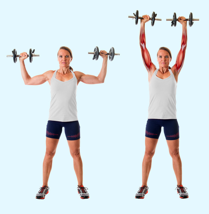 準備動作:身體站穩,雙手各舉一個重量適中的啞鈴。接著慢慢將手臂抬起伸直,直到完全伸展到你的頭上,維持10秒後慢慢放下手臂,直到手臂的三頭肌與地面平行。每12次為1組,每次進行2組。