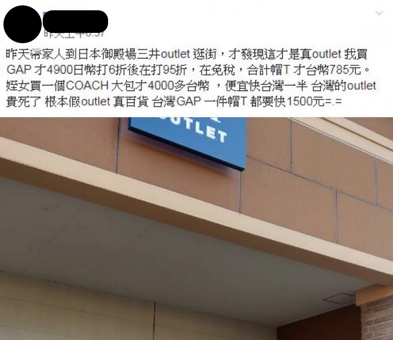 ▼有網友在臉書「爆怨公社」發文,說自己與家人到位於日本靜岡的「御殿場Primium Outlet」購物,在GAP買了一件帽T,原價4900元日幣打6折+95折+免稅後,換算成台幣只要價785元;而同款商品在台灣的Outlet卻要價1500元,貴了將近1倍、比日本原價還貴,讓人傻眼。