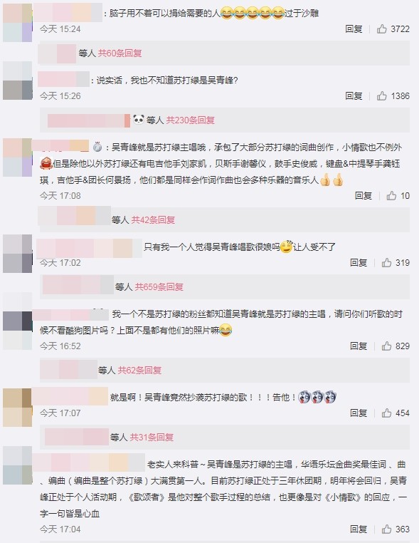 ▼歌迷們哭笑不得,紛紛表示:「這是智商堪憂嗎」、「活久見了」、「是要笑死我嗎,請回去補補課再來評價」、「腦子用不著可以捐給需要的人」、「我不是蘇打綠的粉絲都知道吳青峰就是蘇打綠的主唱」。還有歌迷開玩笑說:「吳青峰連長相都抄襲蘇打綠主唱」。