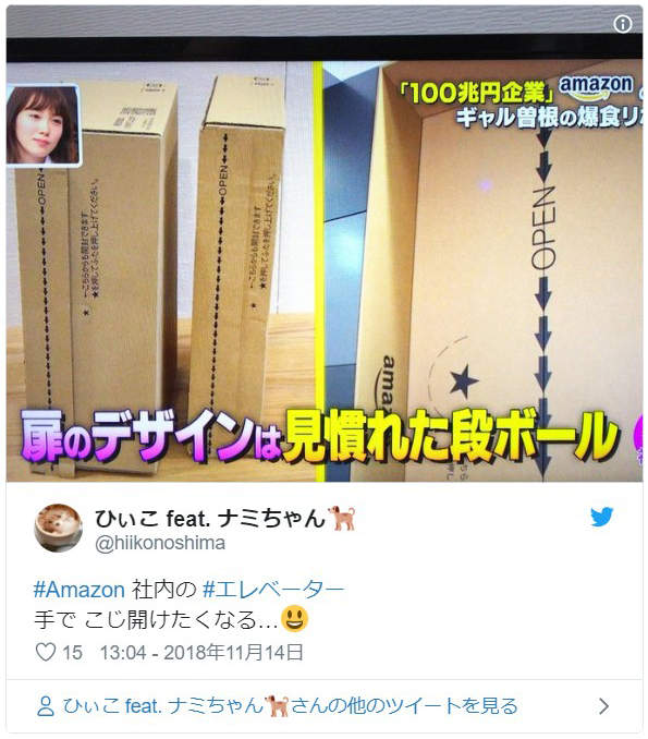 ▼首先是通往辦公室的電梯,竟然設計成了Amazon紙箱的模樣!