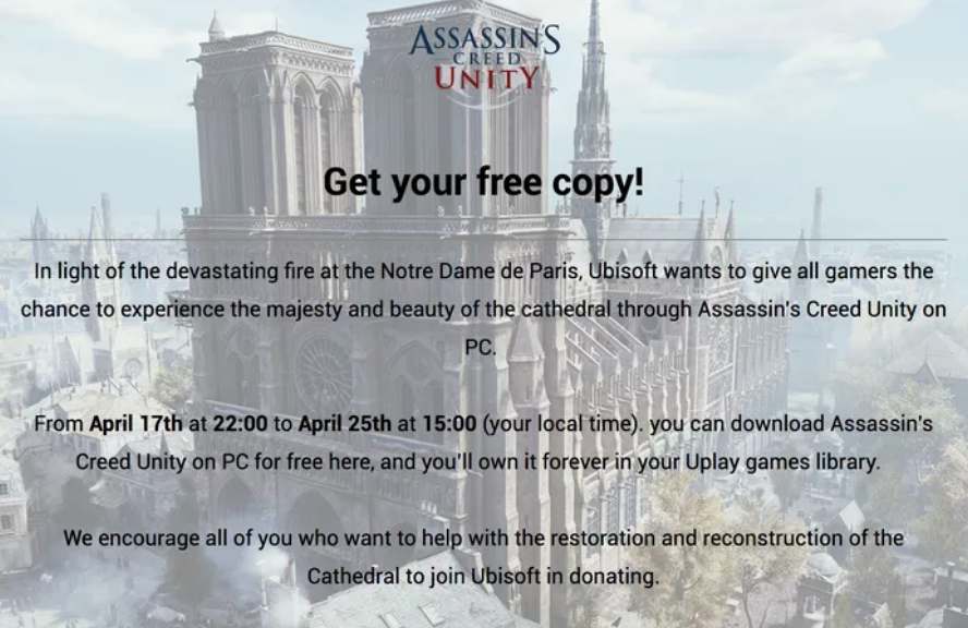 2019年04月18日巴黎聖母院遭遇大火後,世界各地都紛紛有人要幫助重建。之前引起網友熱烈討論的《刺客教條:大革命》(Assassin’s Creed Unity),遊戲公司Ubisoft也表達了對網友的感謝,以及全力支持重建巴黎聖母院的計畫!