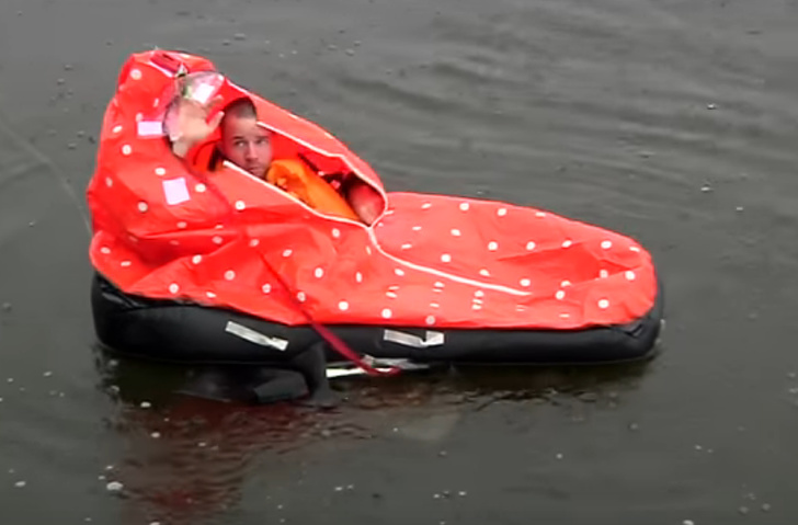 ▼結合了救生艇功能的救生衣,可以讓人不會溺水、失溫。