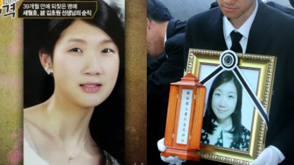 金老師當時身在5樓,比起4樓的老師和學生們更有逃生機會。但她第一時間選擇衝到4樓,拼命幫學生套上救生衣,錯過了逃生機會。船難當天恰巧是金老師的生日,但她卻在2天後冰冷現身,身上還穿戴著學生們送給她的項鍊、耳環等生日禮物。