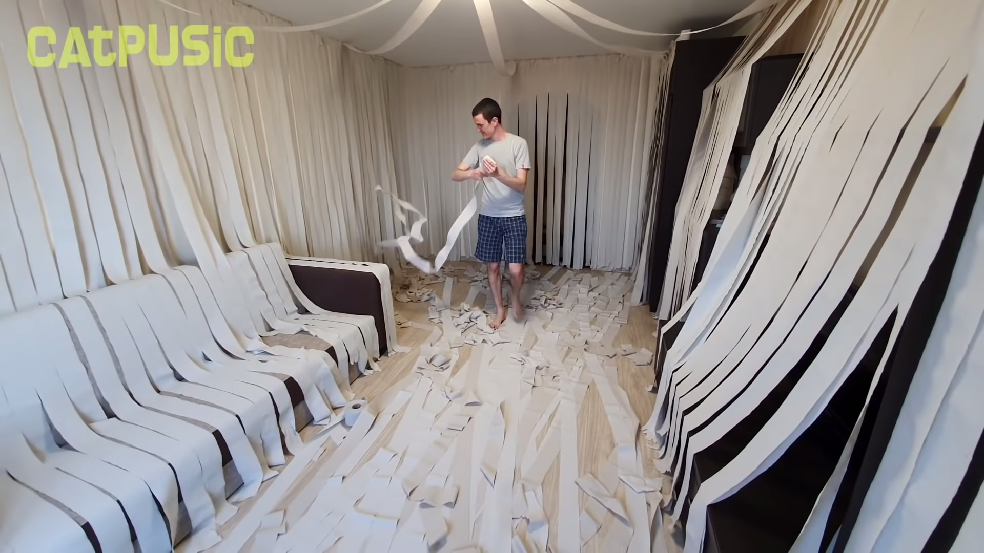 ▼普希克進到佈置完100捲衛生紙的房間後,嗨翻天的玩耍影片。