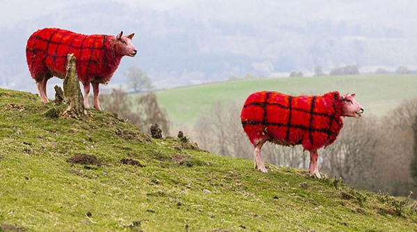 ▼62歲的農場主人馬克辛(Maxine Scott)宣稱她牧場內的兩隻母羊 Daisy 和 April 因為愛喝「Irn-Bru」(一種當地的碳酸飲料),讓牠們身上出現了蘇格蘭紋的模樣。
