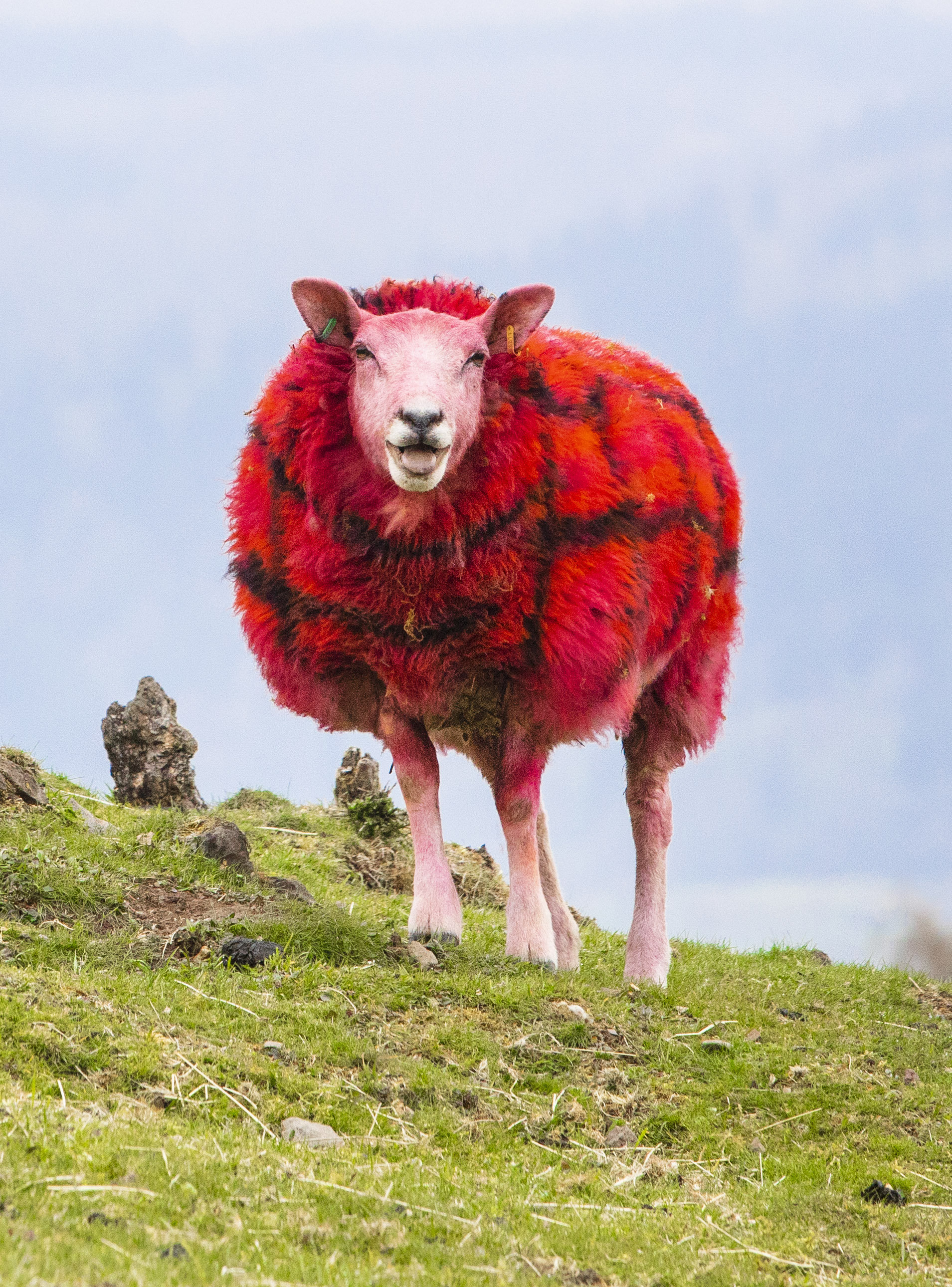 ▼從照片中可以看到,兩隻母羊的皮毛被馬克辛用紅色和黑色噴霧,噴成了紅黑格子圖案的蘇格蘭紋模樣。馬克辛也表示,各國遊客尤其是來自美國的客人,都非常喜歡看到這樣的綿羊,而且這個做法已經行之有年,她只是繼續延續這個傳統而已。