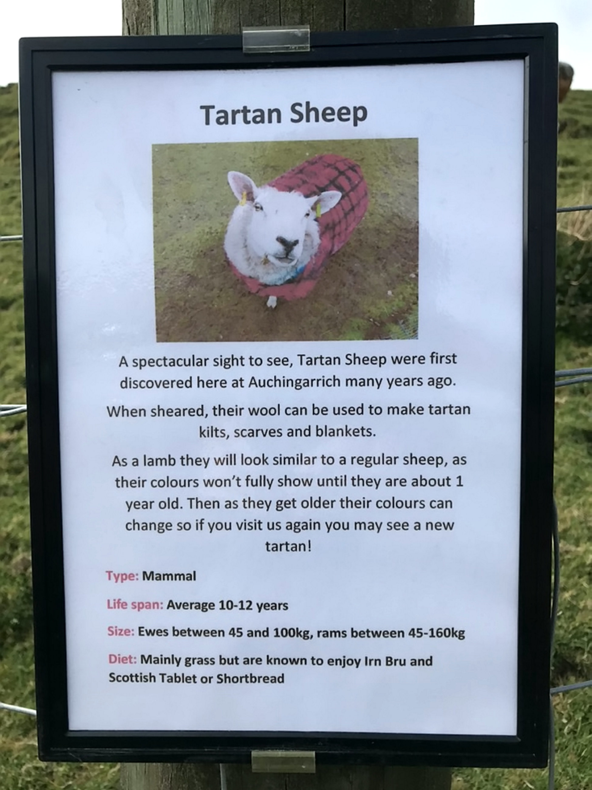 ▼馬克辛還未這些羊立了一個介紹的牌子,上面寫著:「多年前,人們發現了這種格子布綿羊,牠們的毛可以做成短裙和毛毯。雖然牠們小時候跟一般的羊無異,可是到了1歲身上毛髮的顏色就會開始改變,之後就變成了現在這個模樣。牠們只要以草類為食,也喜歡喝 Irn-Bru 碳酸飲料和蘇格蘭脆餅。」