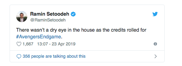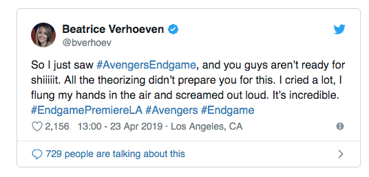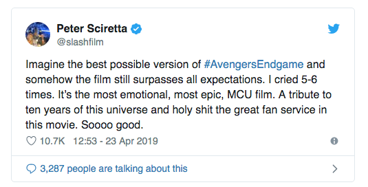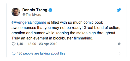 「《終局之戰》太猛了!神片!我出生到現在從沒看過這樣子的電影,這部電影比你能想像的更完美。我笑超大聲、超用力拍手、然後哭超慘!這部電影真的是漫威最厲害的電影!這部電影就是拍給漫威粉絲看的,而且是全世界的漫威粉絲。」