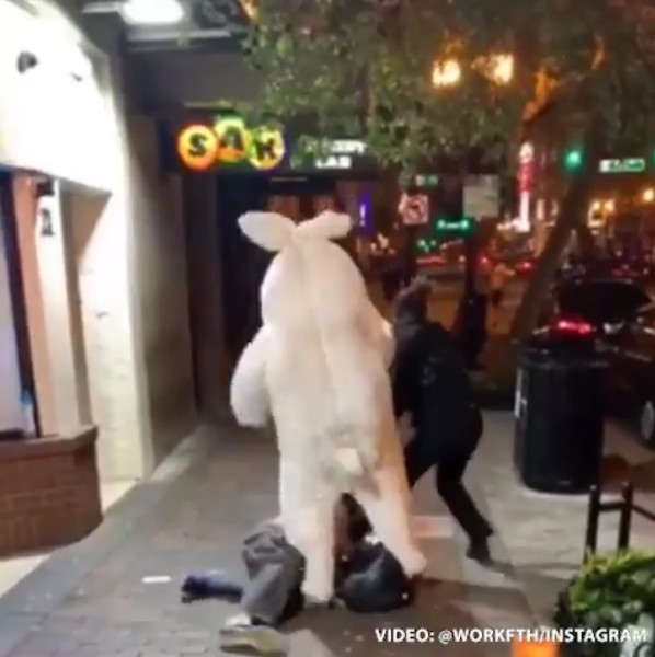 ▼這時候,剛好路過的一隻「復活兔」突然直接衝了過去,協助黑人女子對著這名白人男子一陣暴打,畫面非常滑稽。