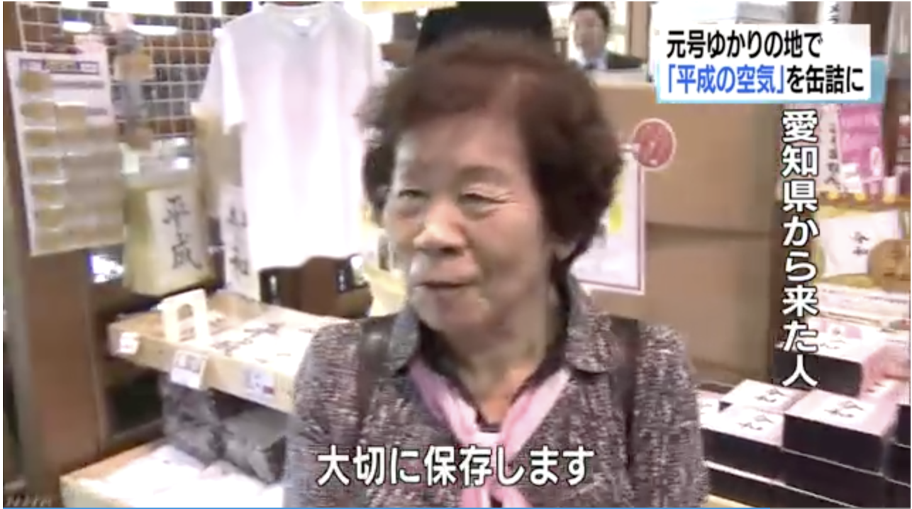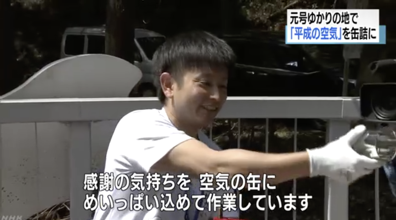 2019年04月25日日本政府在日前宣佈新年號「令和」,如今離告別「平成」、迎接新年好的日子(5/1)也只剩不到一週的時間。位於岐阜的一個村中,有人就抓住了這個改朝換代的商機,把「平成的空氣」裝進罐頭裡。