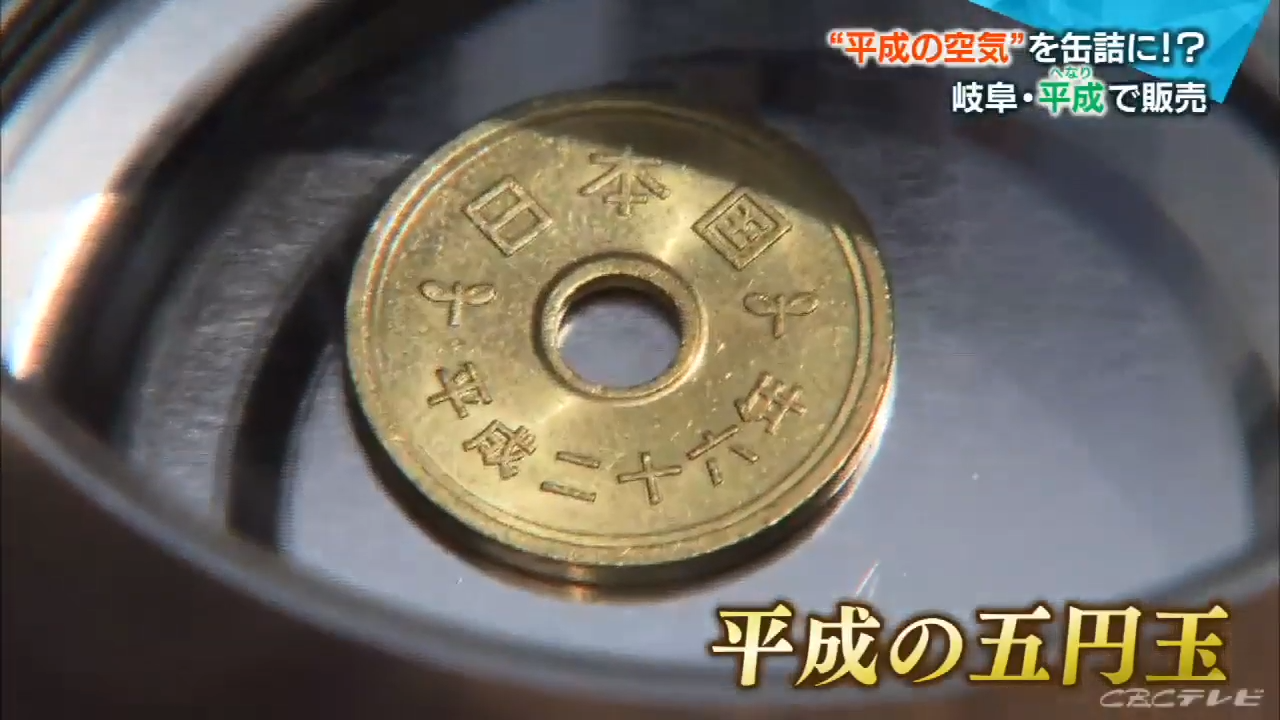 ▼平成空氣罐頭中還會放入平成製造的「五元」硬幣,在日文中音同「緣分(ご縁)」、象徵良緣。