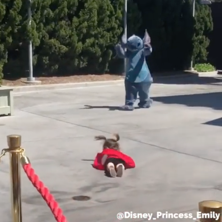 2019年04月25日外國一名小女孩Emily來到迪士尼非常興奮,尤其是看到偶像史迪奇出現的時候更是飛奔衝過去要擁抱,然而她卻一個不小心跌了一跤,正在錄影的媽媽原本以為她會大哭,沒想到史迪奇機智地用一個動作化解尷尬,成功轉移小妹妹的注意力!