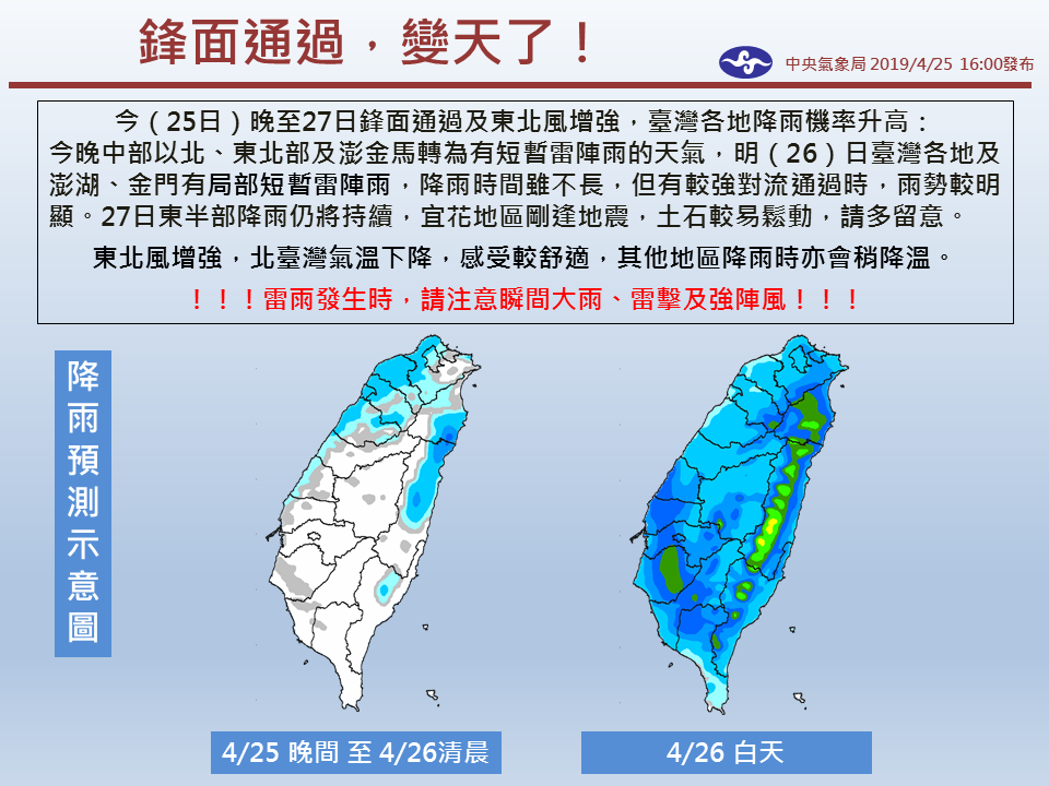 氣象局的臉書粉絲專頁「報天氣-中央氣象局」在4月25日發布了即將變天的消息,指出24日至27日將有鋒面通過,加上東北風增強,台灣各地降雨的機率都大大提高,中部以北、東北部及澎金馬將轉為有短暫雷陣雨的天氣,其他地區及澎湖、金門也有局部短暫雷陣雨。
