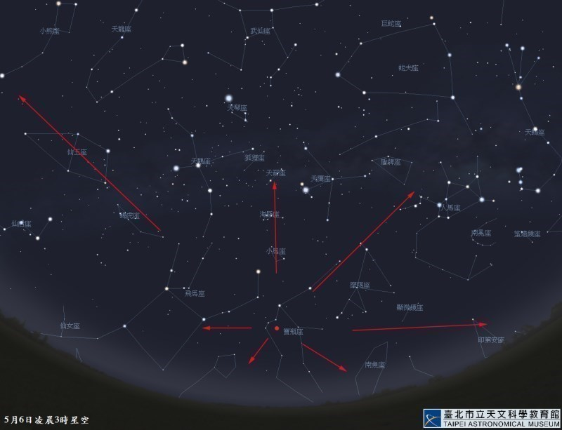 ▼此外,寶瓶座流星雨的輻射點在5/6的前後幾天,將會於凌晨1點多升起,此時較不受月光影響、適合觀測;在這幾天時間,也能在黎明前觀測到每小時約10-30顆流星。而5/5-5/6期間將會有一段較長時間的高峰期、且5/3-5/10期間,推測將會有30顆以上的流星。