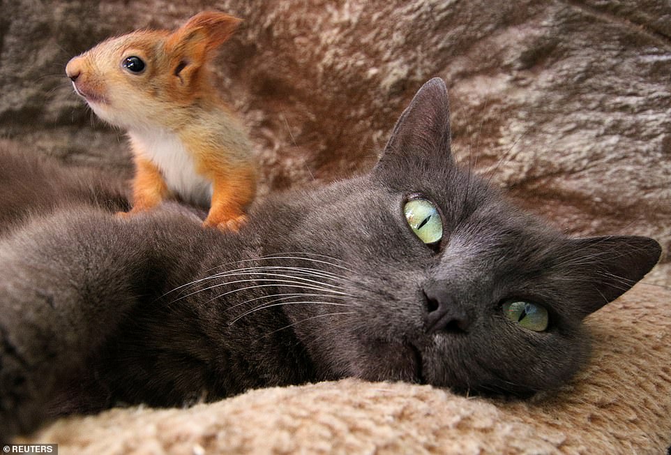 ▼這隻叫Pusha的貓咪住在距離克里米亞首都約32公里處,巴赫奇薩賴(Bakhchisaray)一處河邊的小山谷裡。牠收養了4隻失去父母的小松鼠。