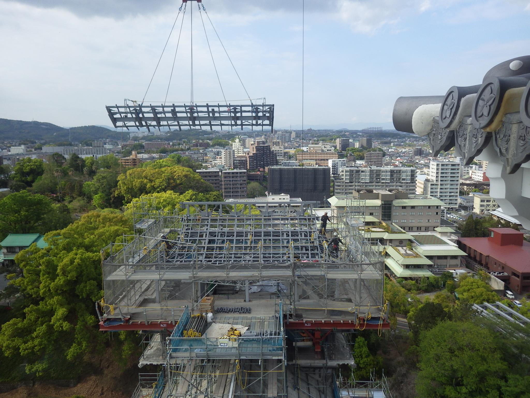 ▼現在主要的復原工程只剩旁邊的小天守閣,從最新的施工圖可以看到,匠人已經重新安裝骨架,準備搭建外圍的木造結構。