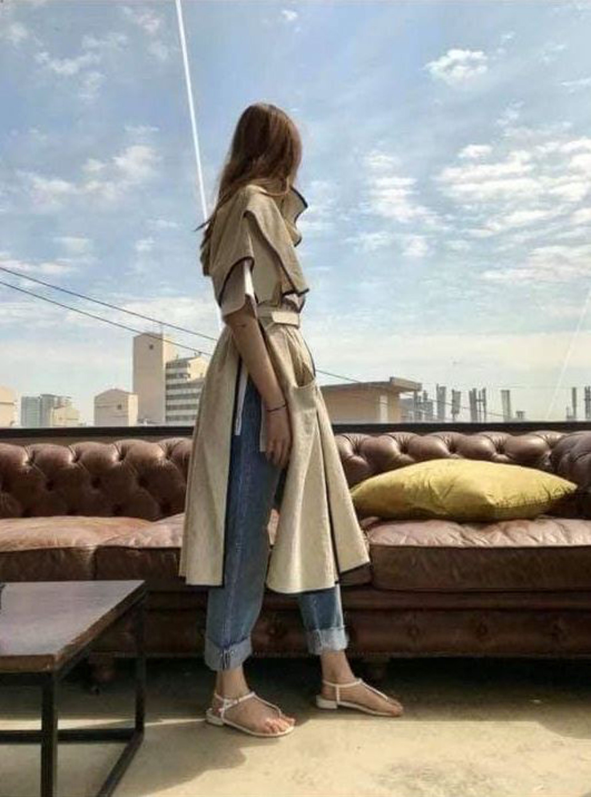 ▼網友po出的照片中,女子身穿一款短袖長款的素色罩衫,搭配九分牛仔褲和涼鞋。這另類的顏色和款式讓網友忍不住聯想到「孝服」。