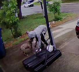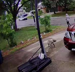 ▼從影片中可以看到這隻比特犬似乎很興奮,以為是主人要帶牠出去散步,但當女子走到郊區時,將狗狗綁在馬路旁的籃球網的金屬欄杆上,便匆匆離去。
