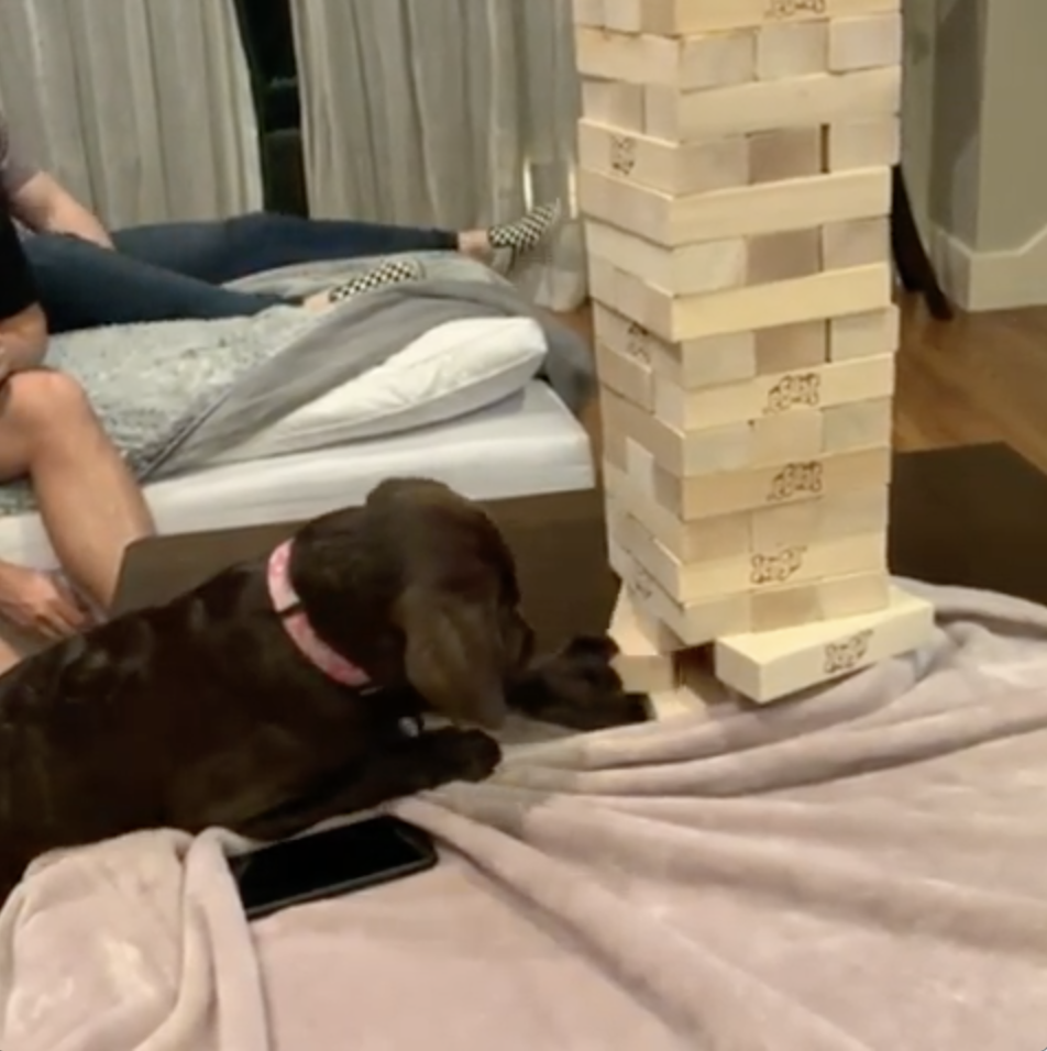 ▼拉布拉多「雷米(Remy)」的主人「艾許莉(Ashley Agapiou)」表示,當時家裡在開派對,大家正在看球賽看得很嗨,中間放的疊疊樂是為了讓不想看球賽的人可以玩的。