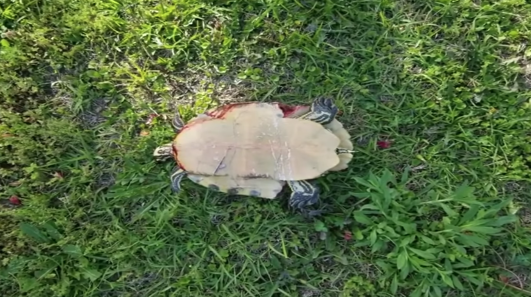 ▼烏龜可能是經擠壓彈射後,不幸飛向John的車。