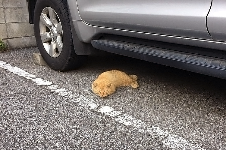 ▼日網友在車底下目擊睡成「炸蝦」的虎斑浪喵,這個縮起來的腳腳完全就是蝦尾無誤!