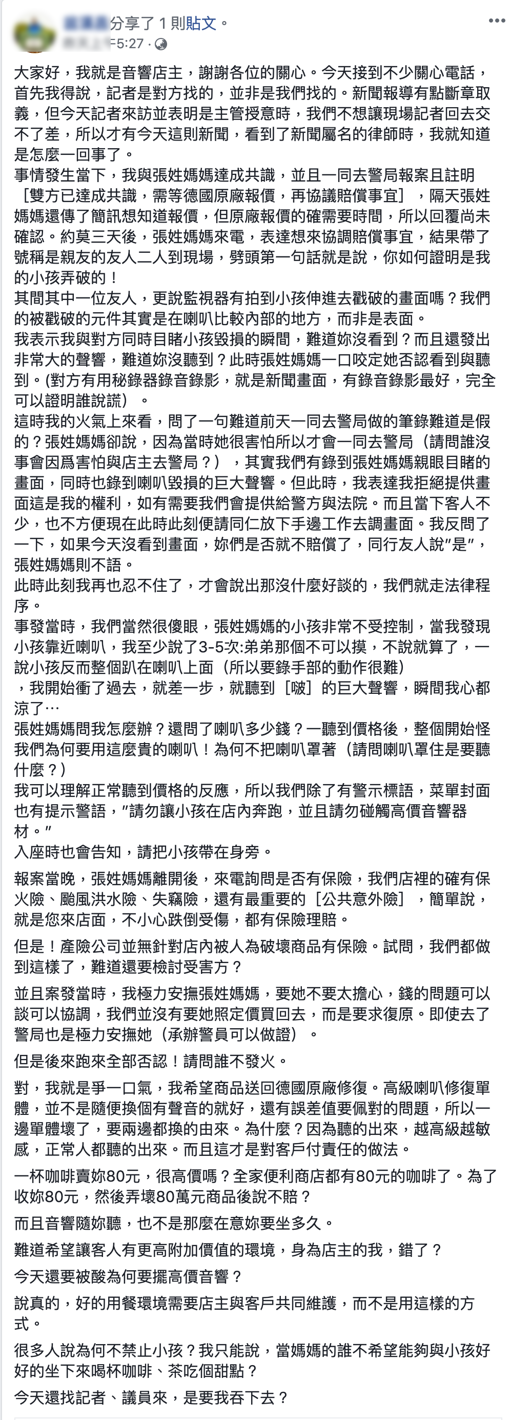 ▼業者表示,當時張姓媽媽帶3歲兒子來喝下午茶,小孩卻非常不受控,在店內跑來跑去亂摸。事發前,他們已經警告3到5次,並大喊:「弟弟,那個不可以摸!」沒想到男童聽了勸阻,卻直接往音響上趴上去。