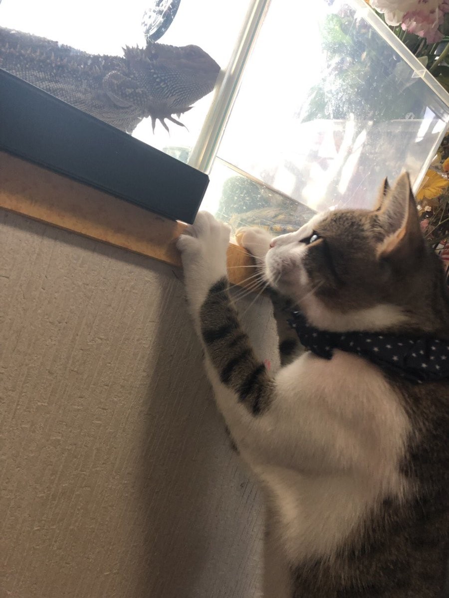 2019年05月13日很多喜歡爬行寵物的人,都是從鬃獅蜥開始養起的。鬃獅蜥比較溫和,照顧起來也簡單,日本推特網友ASCOT家就有一隻鬃獅蜥。為了讓牠住得舒服一點,ASCOT準備了設備齊全的爬蟲箱。沒想到家中的貓咪也喜歡上了這個爬蟲箱,還偷偷溜了進去。