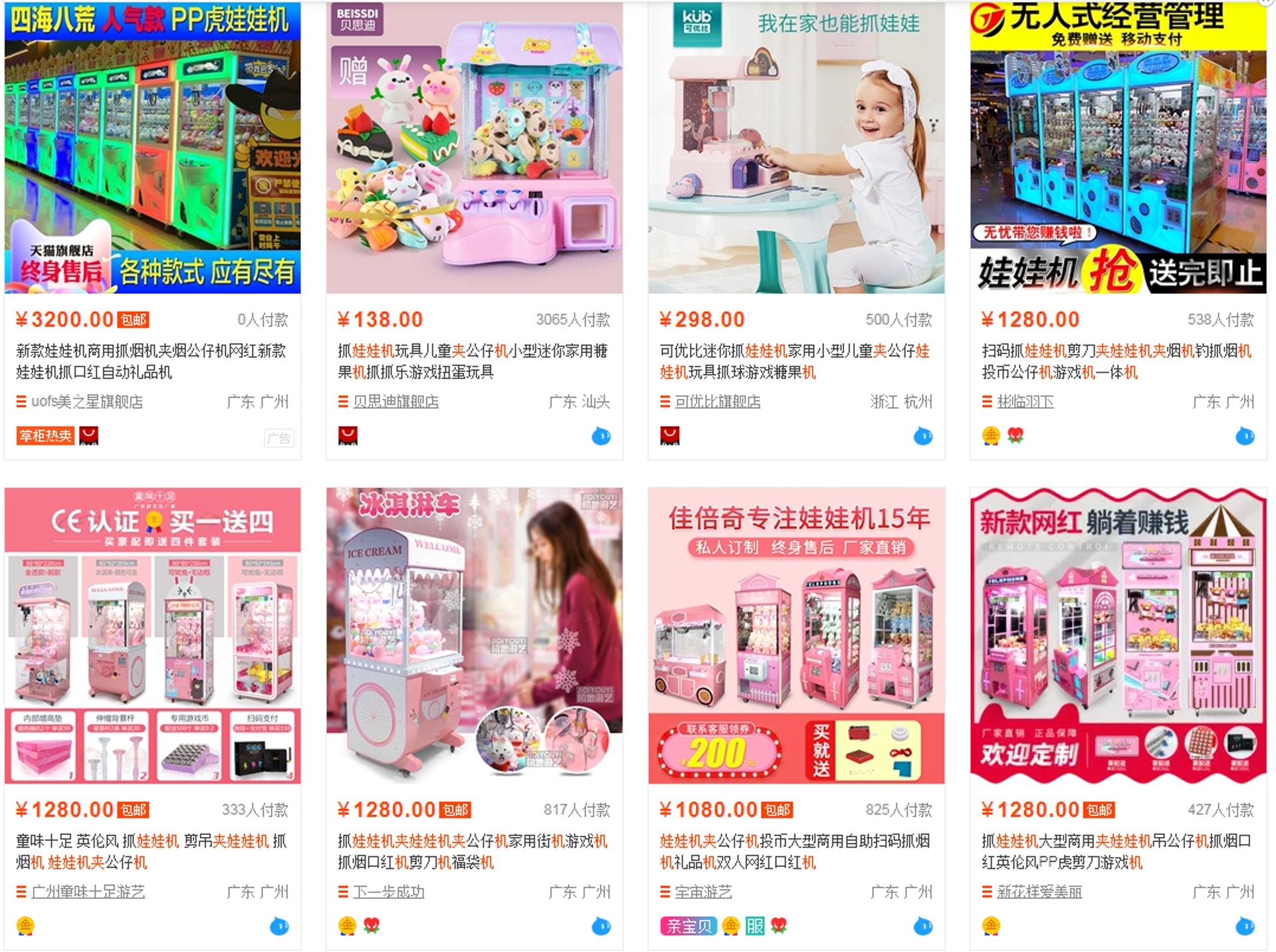 ▼淘寶上販賣多款夾娃娃機,售價多由千元人民幣(約新台幣5千元)起跳,加上夾娃娃機本身是體積龐大的重物,運費也不便宜。