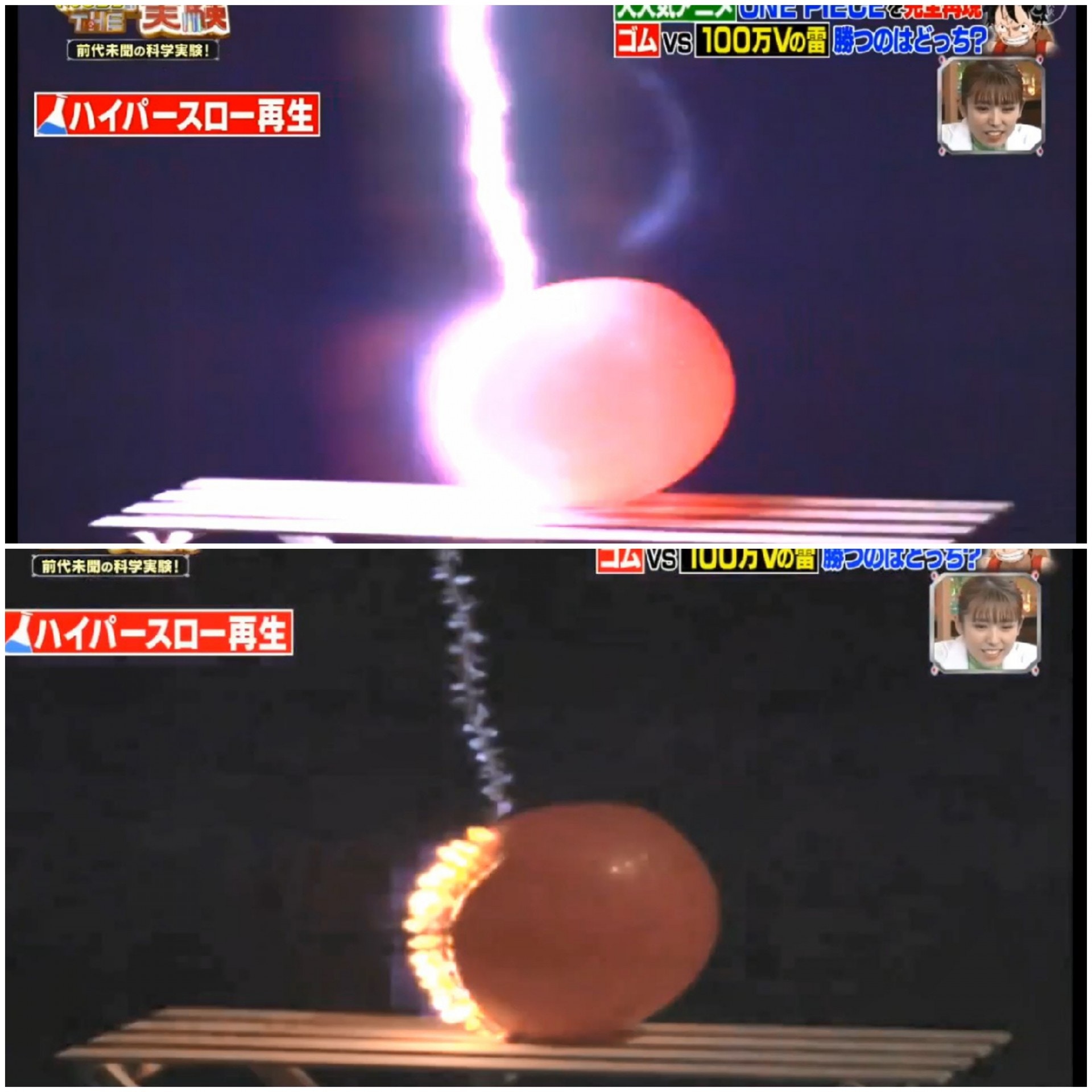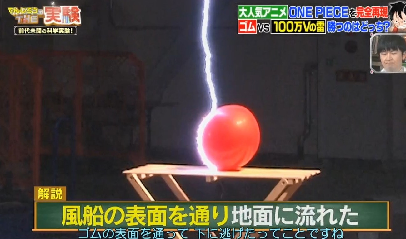 原來橡膠真的是對雷電完全絕緣,即使是百萬伏特的電擊也無法弄破一顆氣球。這也難怪魯夫可以打敗超強大的雷神艾尼路了,因為他就是對方的「天敵」啊!