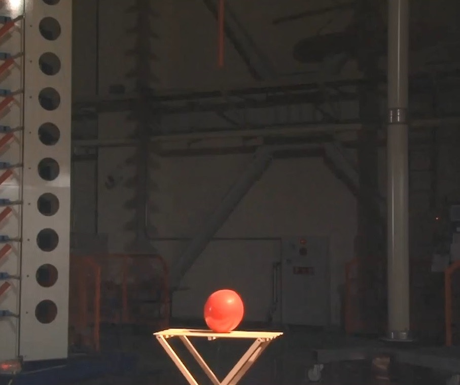 ▼科學家將易燃的氫氣注入氣球當中,再讓百萬伏特的電擊打在氣球上,如果可以穿透氣球,那氣球就會燒起來。實驗結果顯示,百萬伏特的電擊只讓氣球冒出了少許煙。
