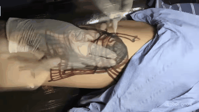 ▼刺青師傅先在原本的刺青上,畫上一些新圖案的輪廓。