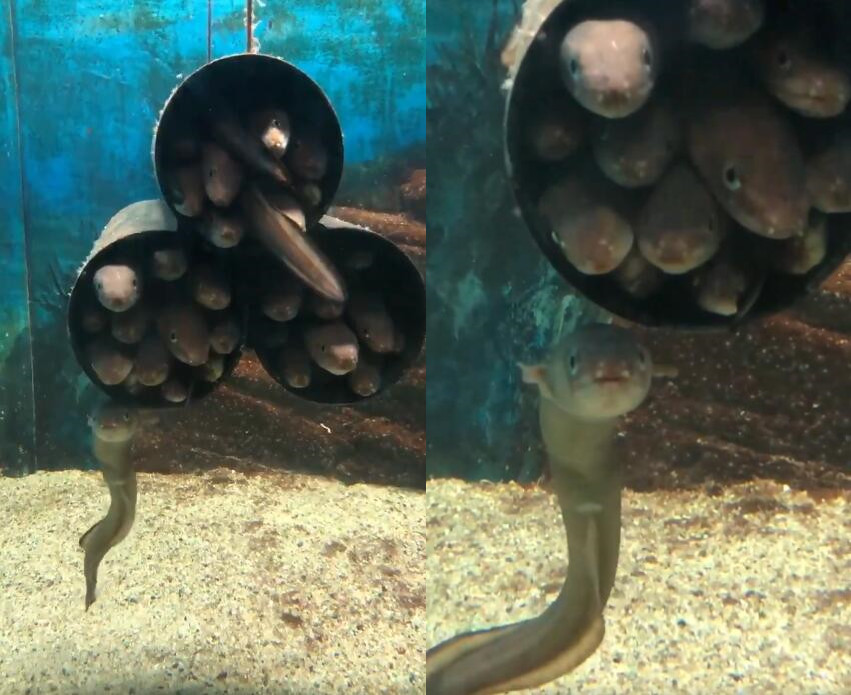 ▼影片中一群星康吉鰻整整齊齊得鑽在管子裡,將管子塞的滿滿的,而在左下角,還有一隻沒能擠進去的星康吉鰻,為了固定位置不停地遊動著,頭部緊貼著管子,假裝自己已經在管子裡了,自欺欺人的搞笑畫面引得遊客一陣笑聲。