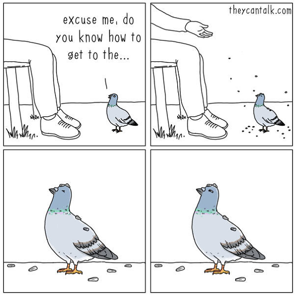 ▼1.「不好意思~請問你知道怎麼去⋯」,結果人類一把飼料撒下去~